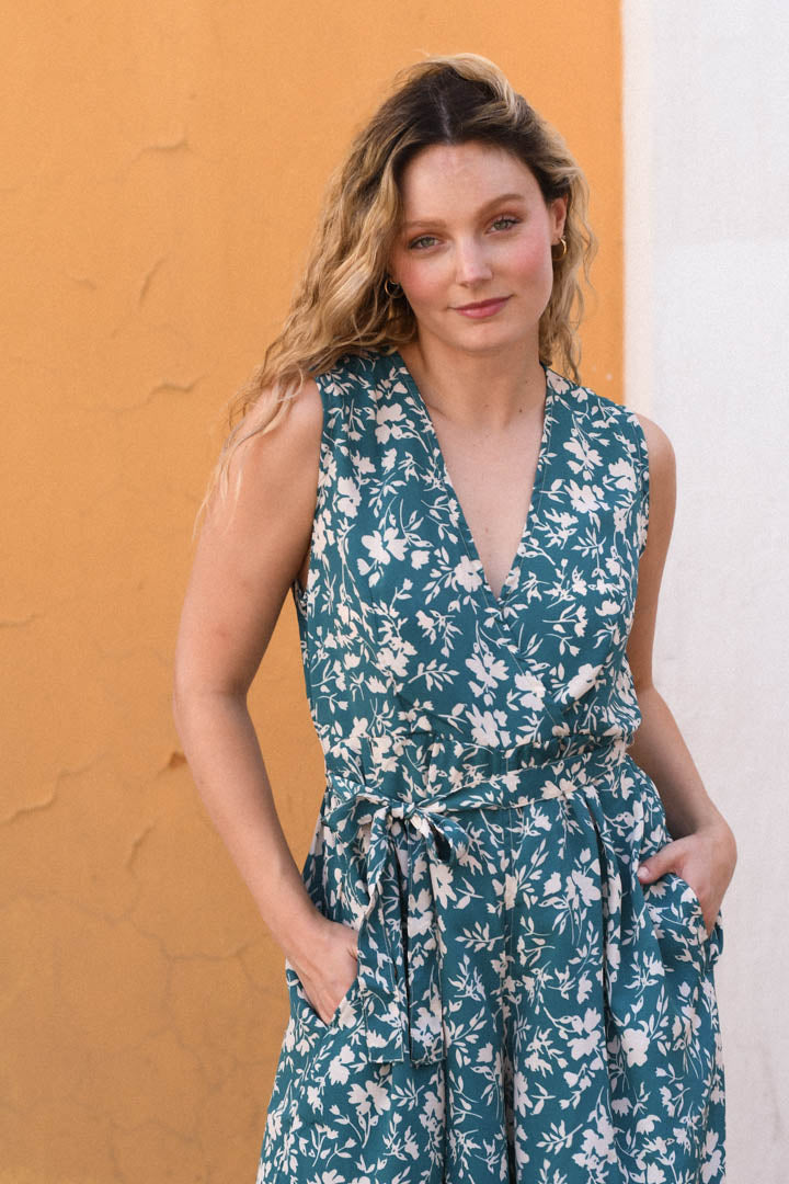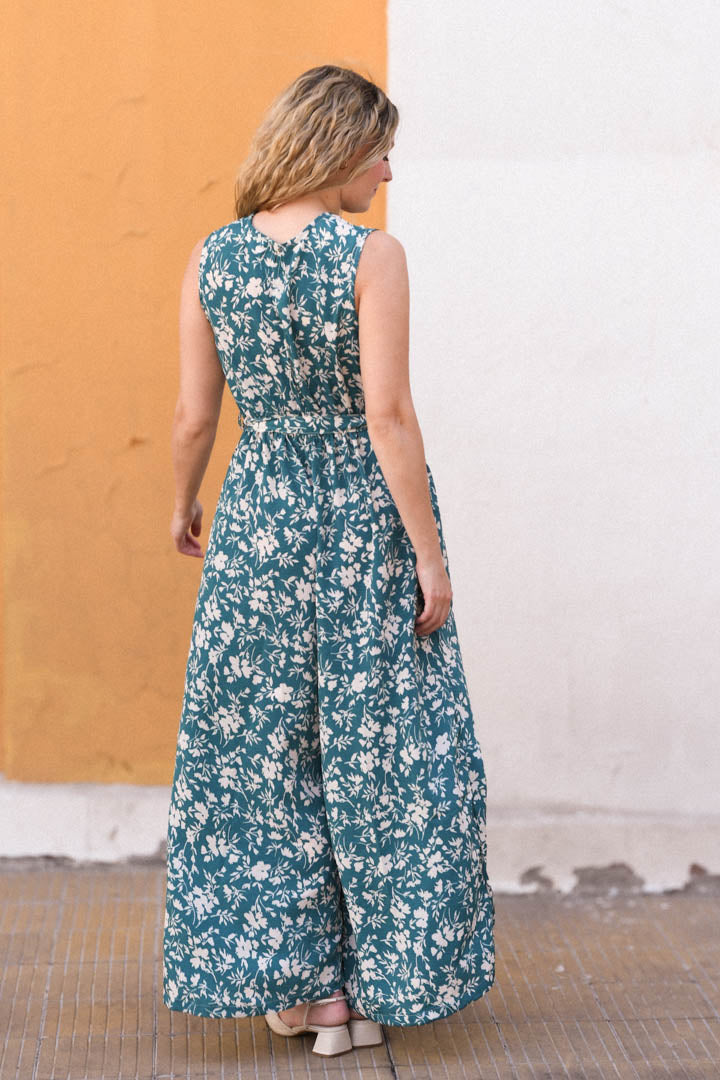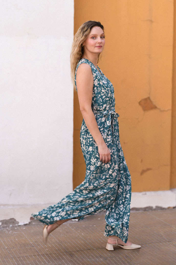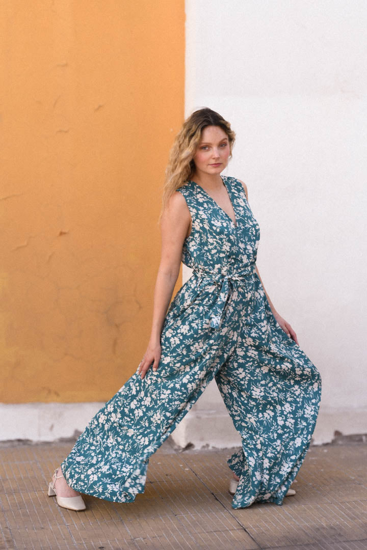 Diseño: Enterito largo con escote en V, corte en la cintura y lazo ajustable para definir la silueta. De calce suelto y pierna ancha, que aporta comodidad y un look relajado pero elegante.