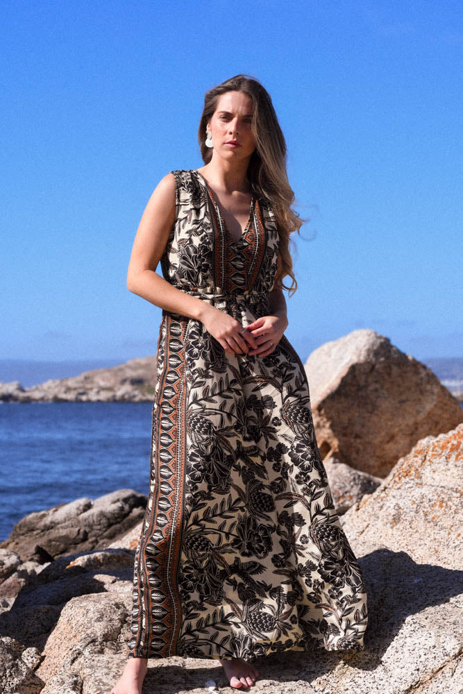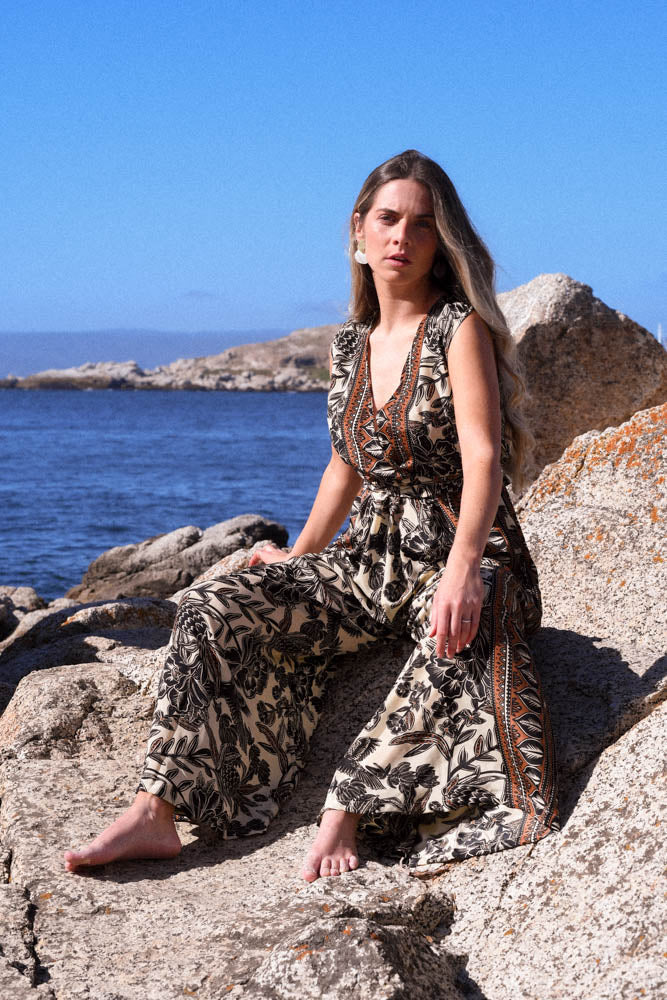 Diseño: Enterito largo con escote en V, corte en la cintura y lazo ajustable para definir la silueta. De calce suelto y pierna ancha, que aporta comodidad y un look relajado pero elegante.