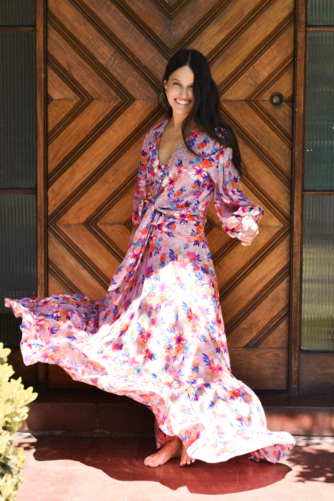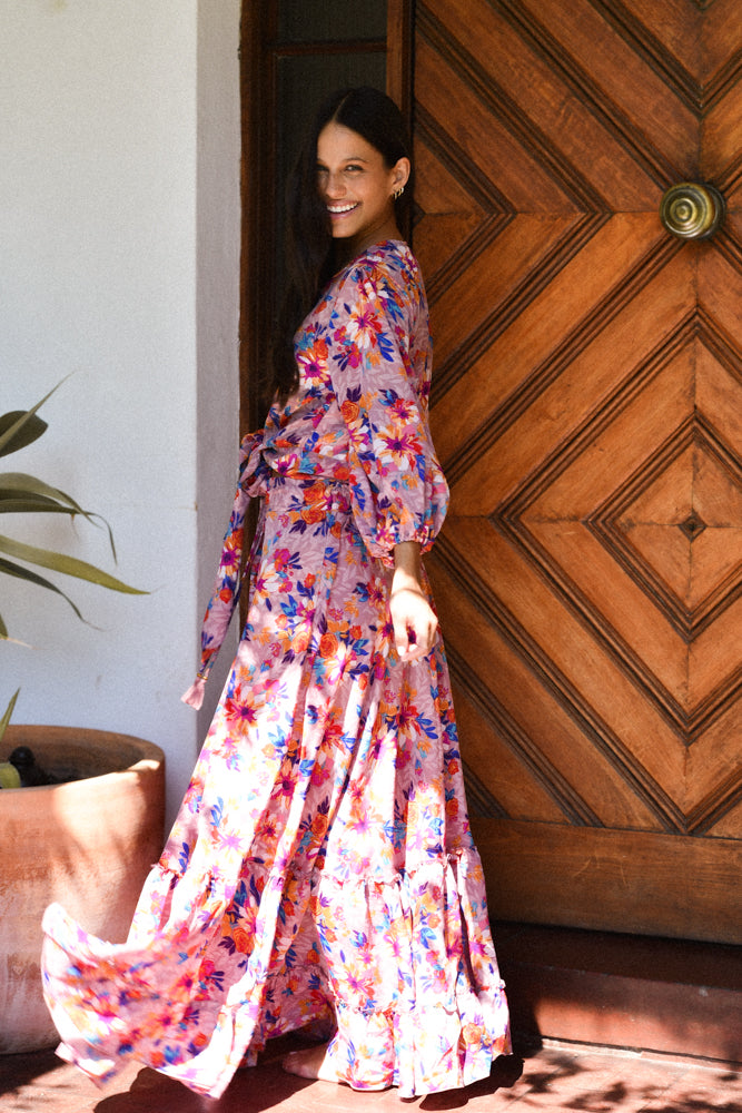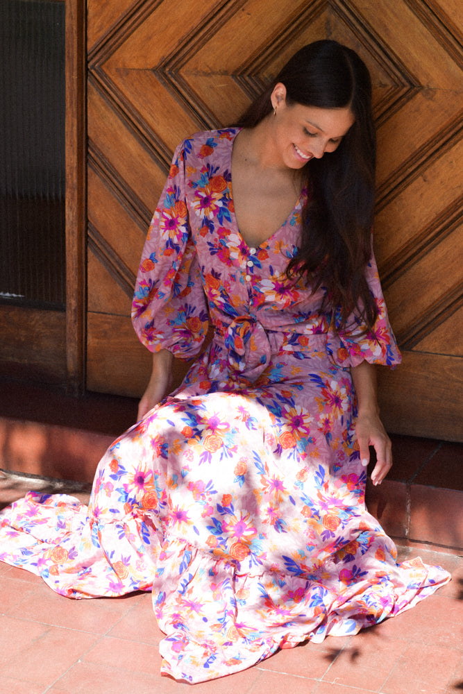 Diseño: Falda larga de tiro a la cintura, silueta evasé con mucho vuelo y panel inferior con volante para un efecto más amplio al caminar. Estampado floral en base lila con acentos fucsia, coral y azules.
