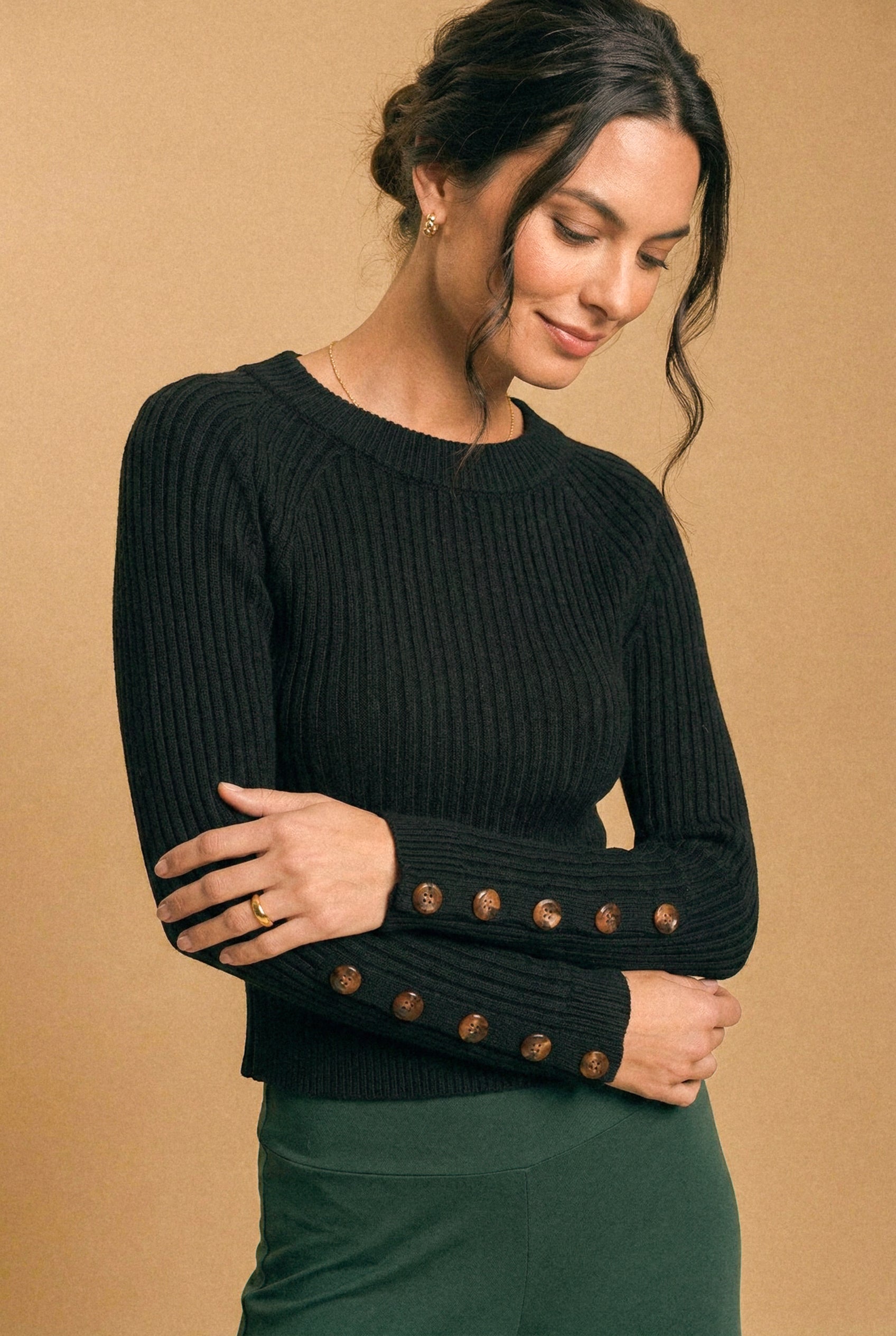 Diseño: Top de corte recto y ligeramente cropped, con cuello redondo y mangas largas. El detalle de botones grandes en la parte baja de las mangas le da un carácter único y elegante. Su diseño atemporal lo hace ideal para quienes buscan un básico con personalidad.