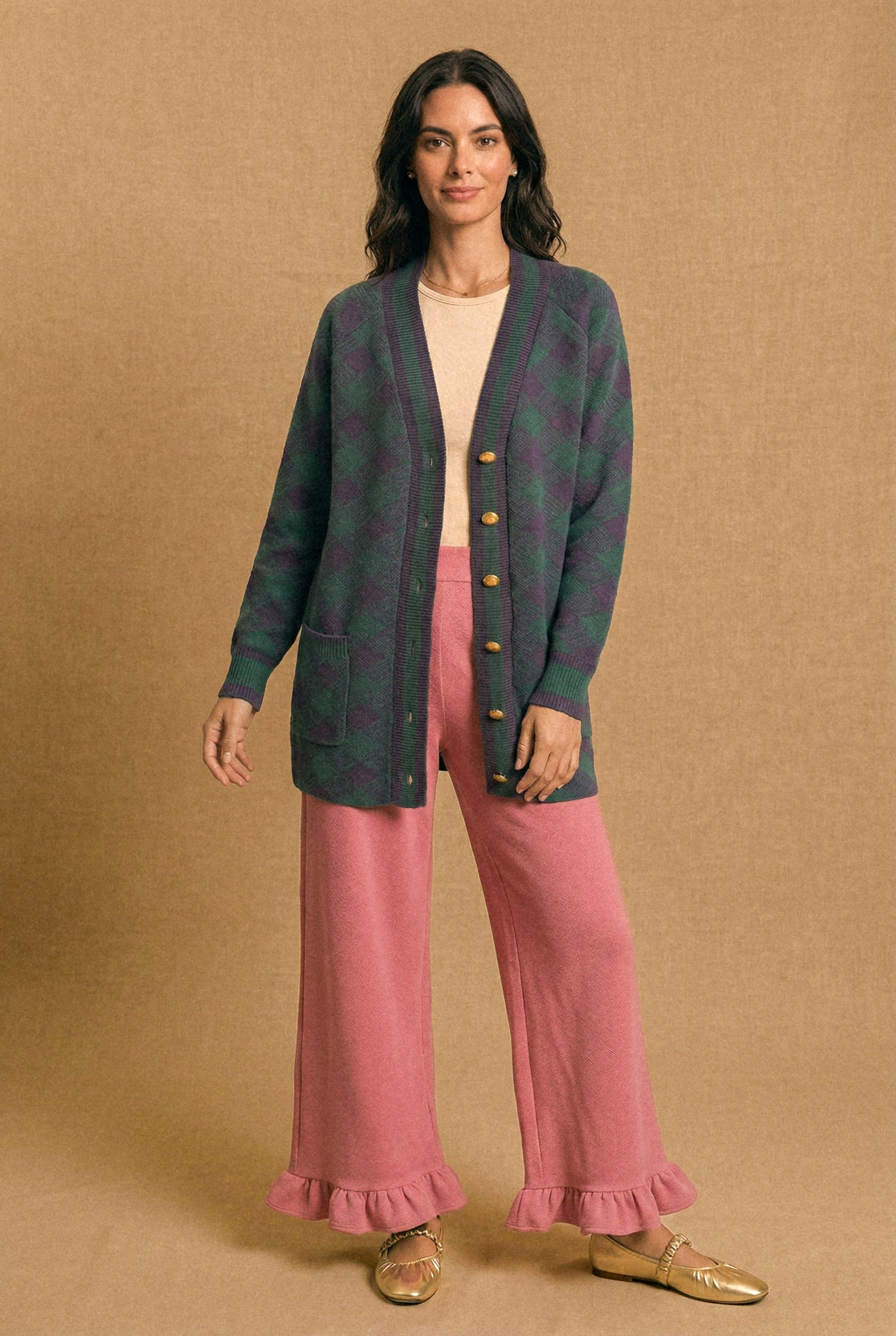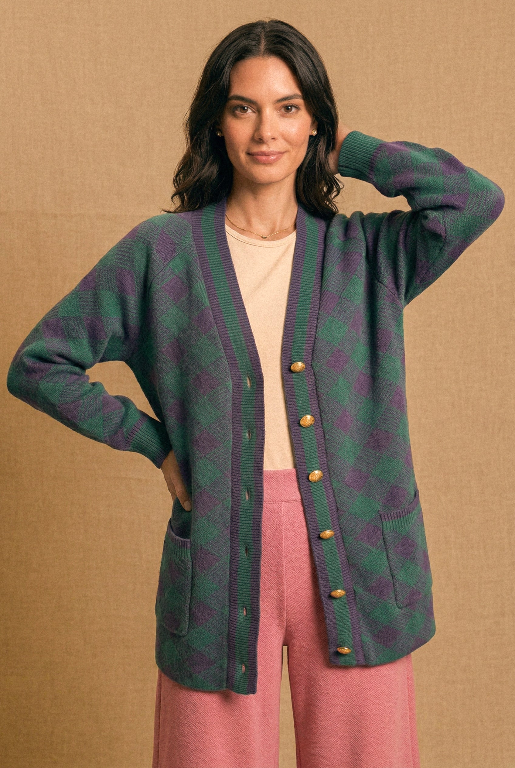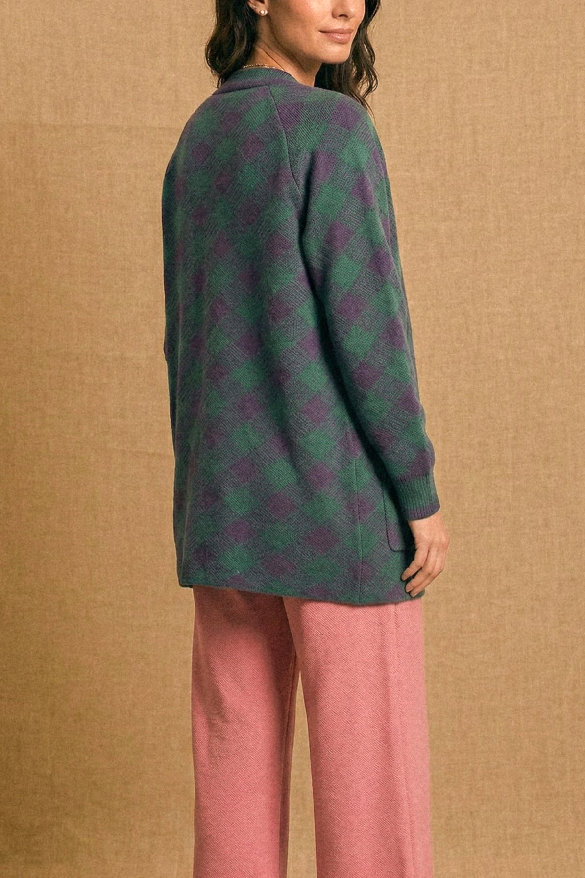 • Diseño: Cárdigan largo con escote en V y botones dorados al frente. Tiene bolsillos aplicados y un diseño de rombos escoceses en verde y azul marino, que se complementa con bordes acanalados en azul profundo. Es parte de un conjunto que puede combinarse con la Falda Billard a juego, para un look coordinado y sofisticado.