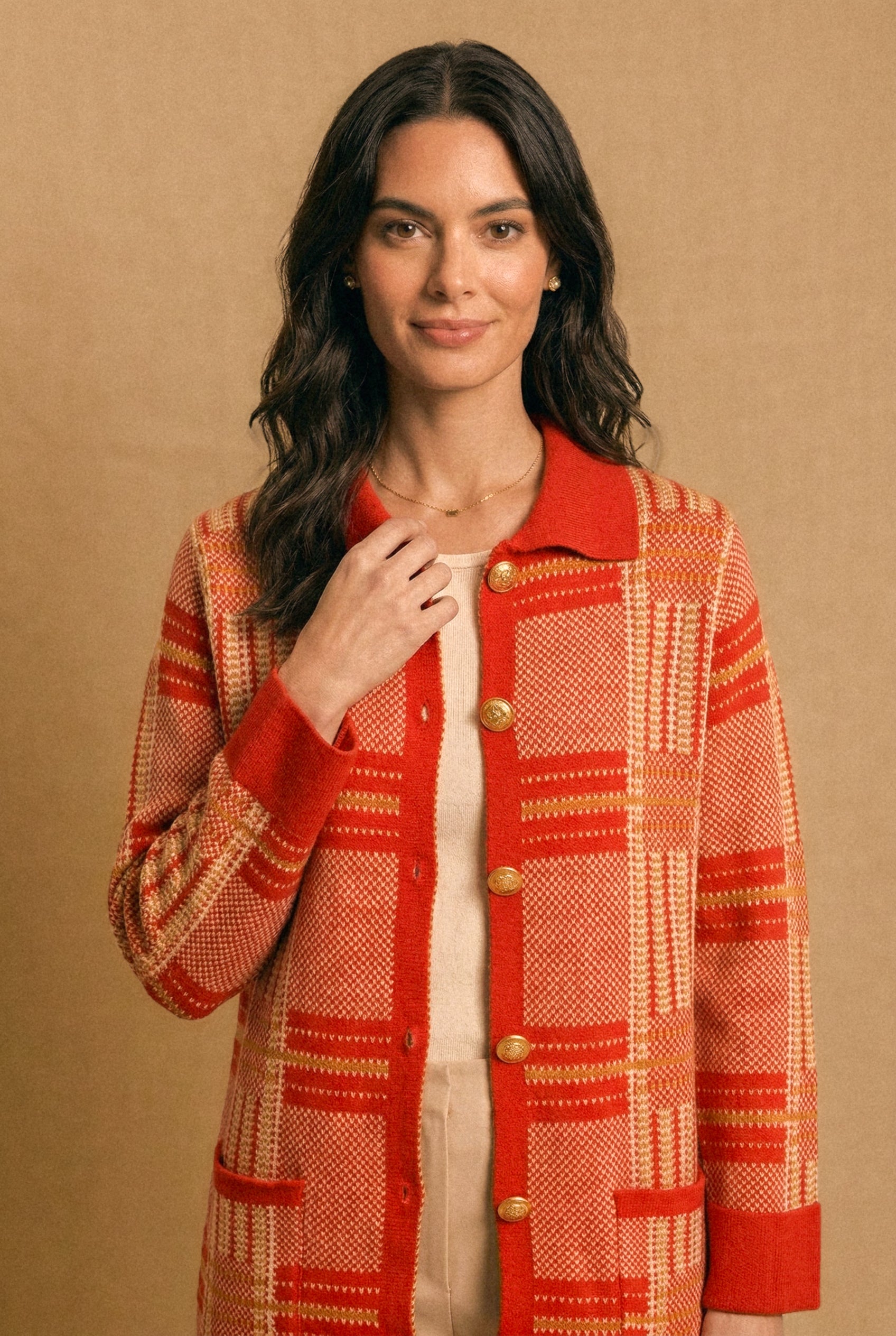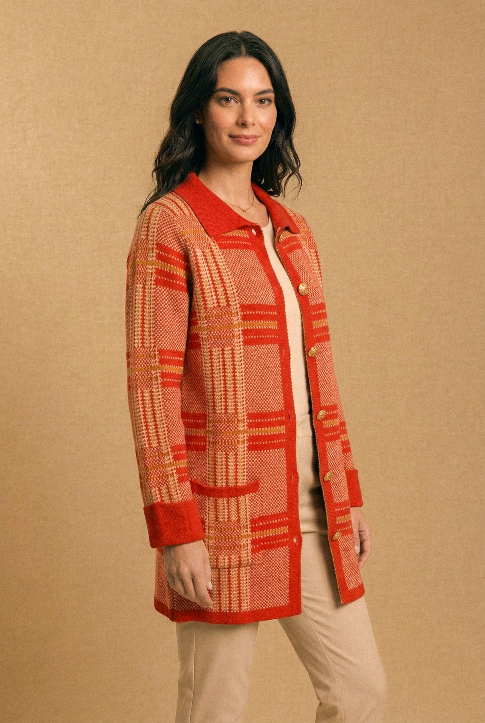 • Diseño: Tejido largo con estampado escocés en tonos vibrantes, botones dorados de inspiración vintage y bolsillos delanteros funcionales. El cuello tipo camisa le da un aire elegante y clásico. Está disponible en combinaciones de azul con crudo y rojo, verde con crudo y negro, y rojo con mostaza y crudo.