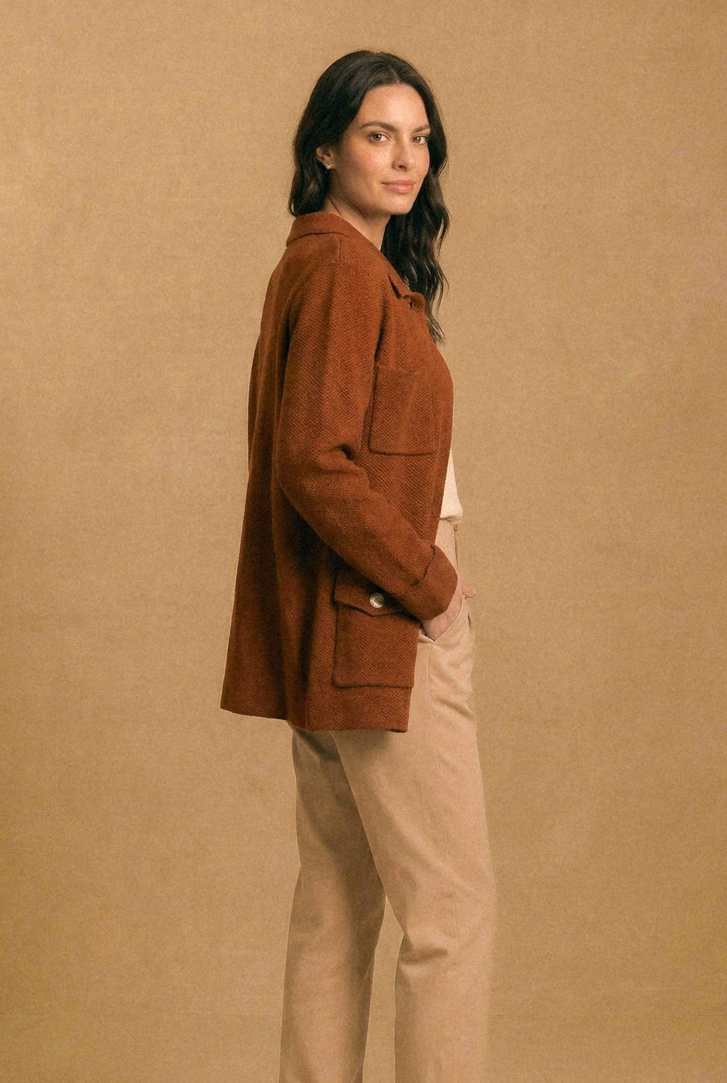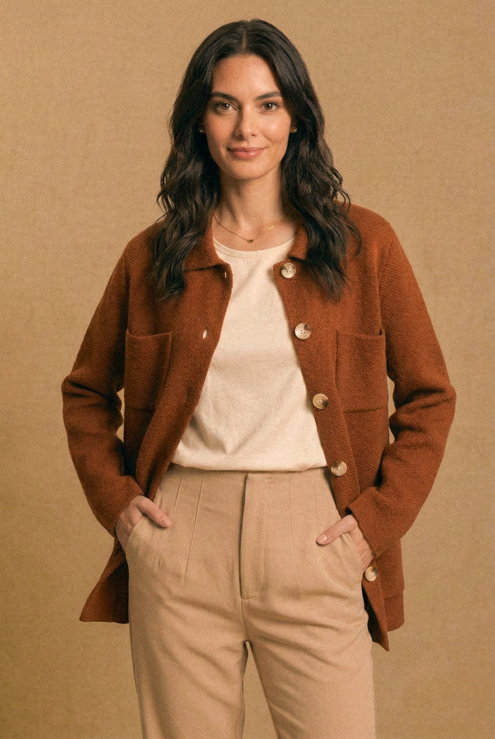 Diseño: Tejido tipo chaqueta con estructura recta, botones medianos de acabado nácar y múltiples bolsillos de parche al frente, que aportan carácter y funcionalidad. El cuello clásico y el largo a la cadera lo hacen una prenda versátil y atemporal. Disponible en camel, crudo y verde musgo.