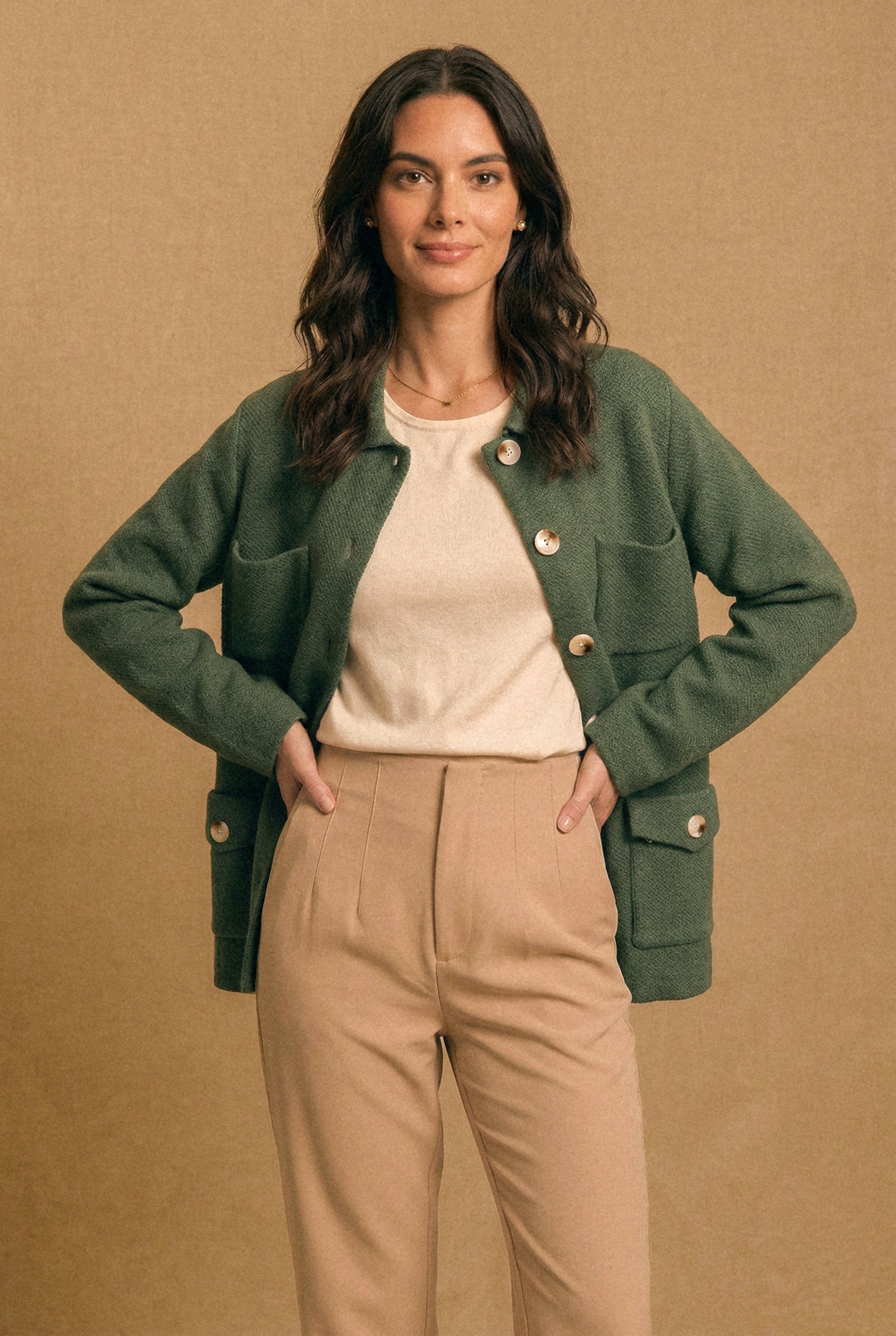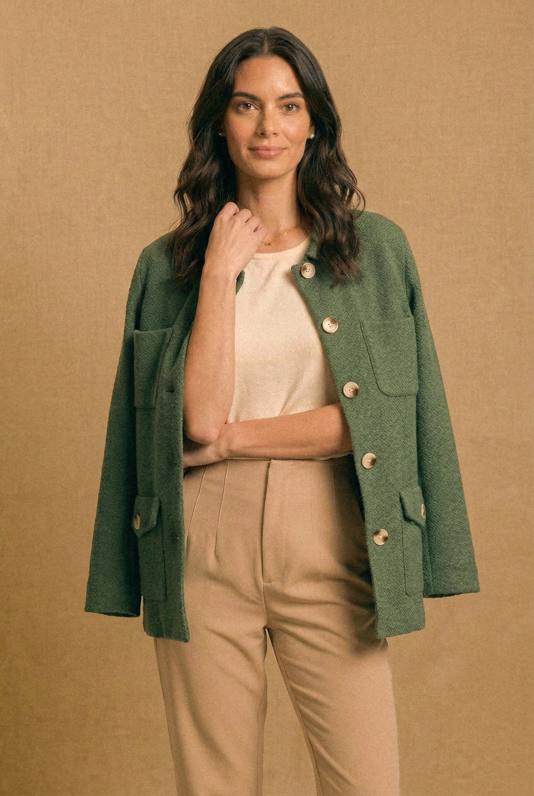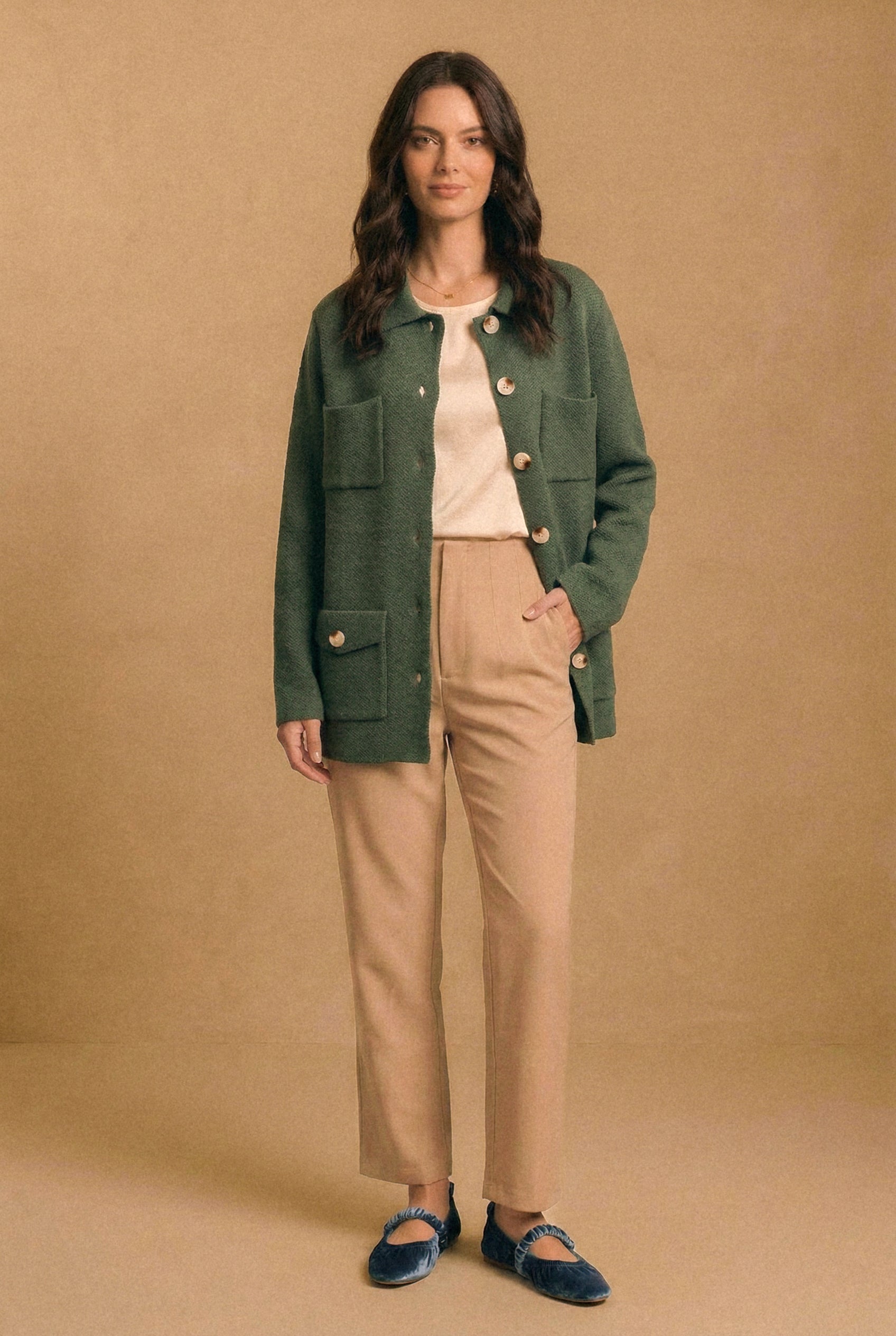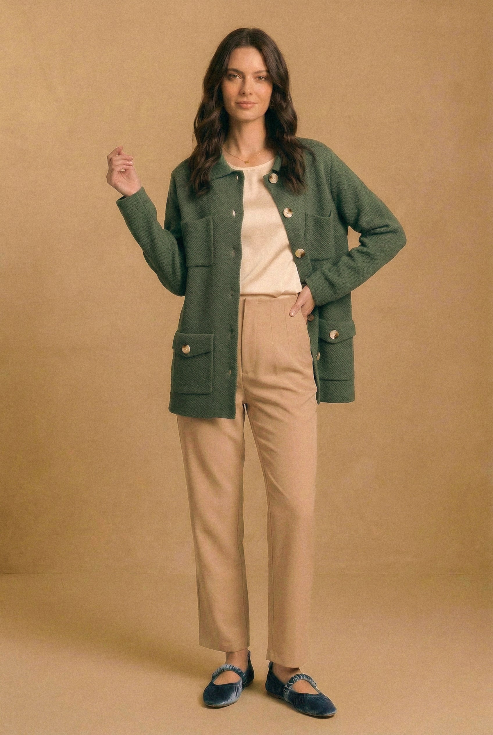 • Diseño: Tejido tipo chaqueta con estructura recta, botones medianos de acabado nácar y múltiples bolsillos de parche al frente, que aportan carácter y funcionalidad. El cuello clásico y el largo a la cadera lo hacen una prenda versátil y atemporal. Disponible en camel, crudo y verde musgo.