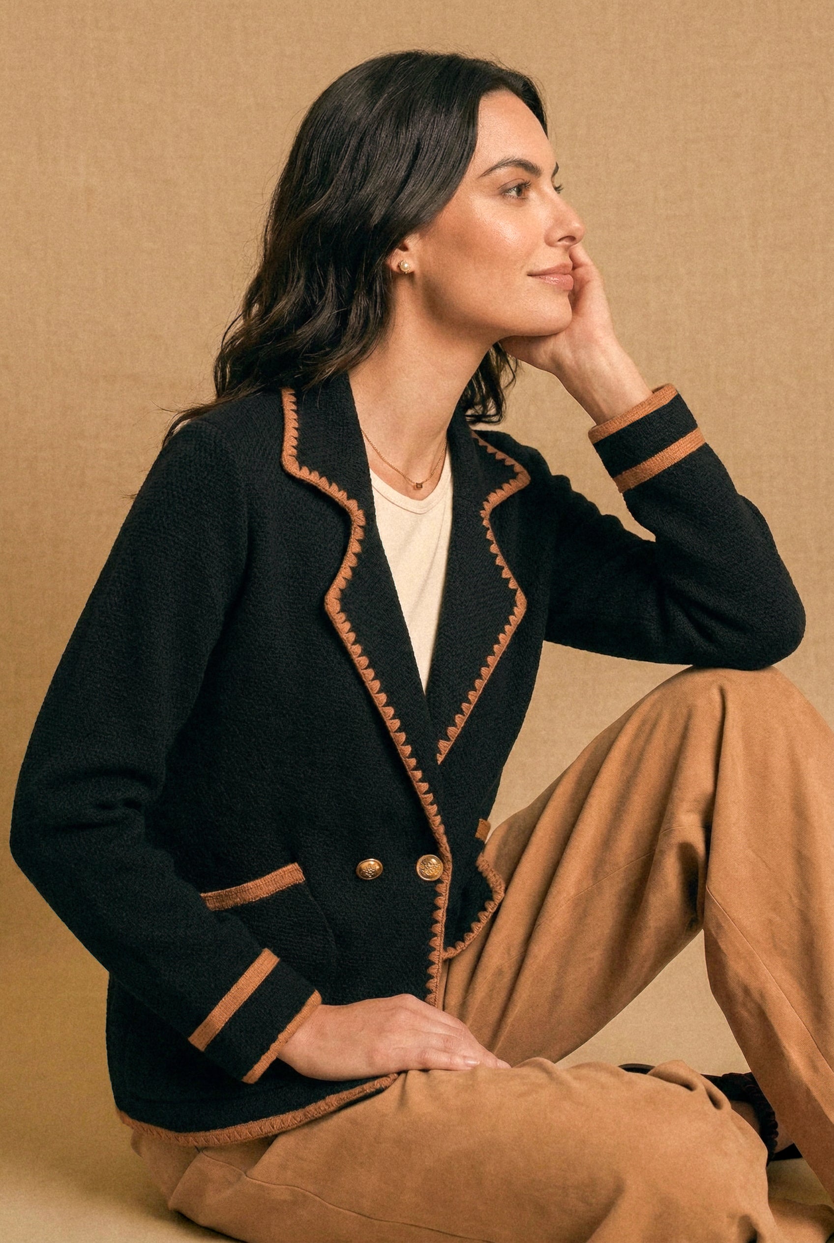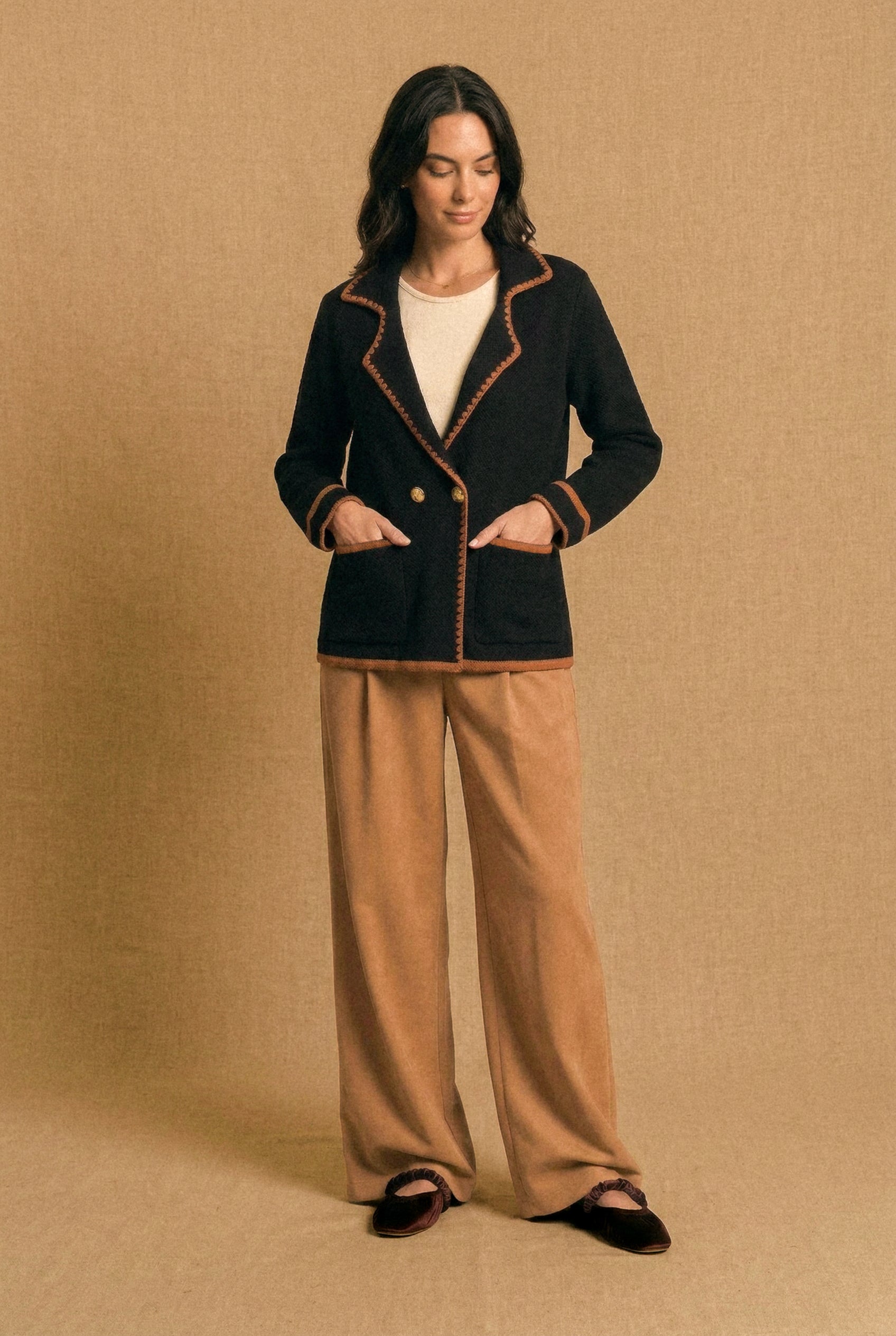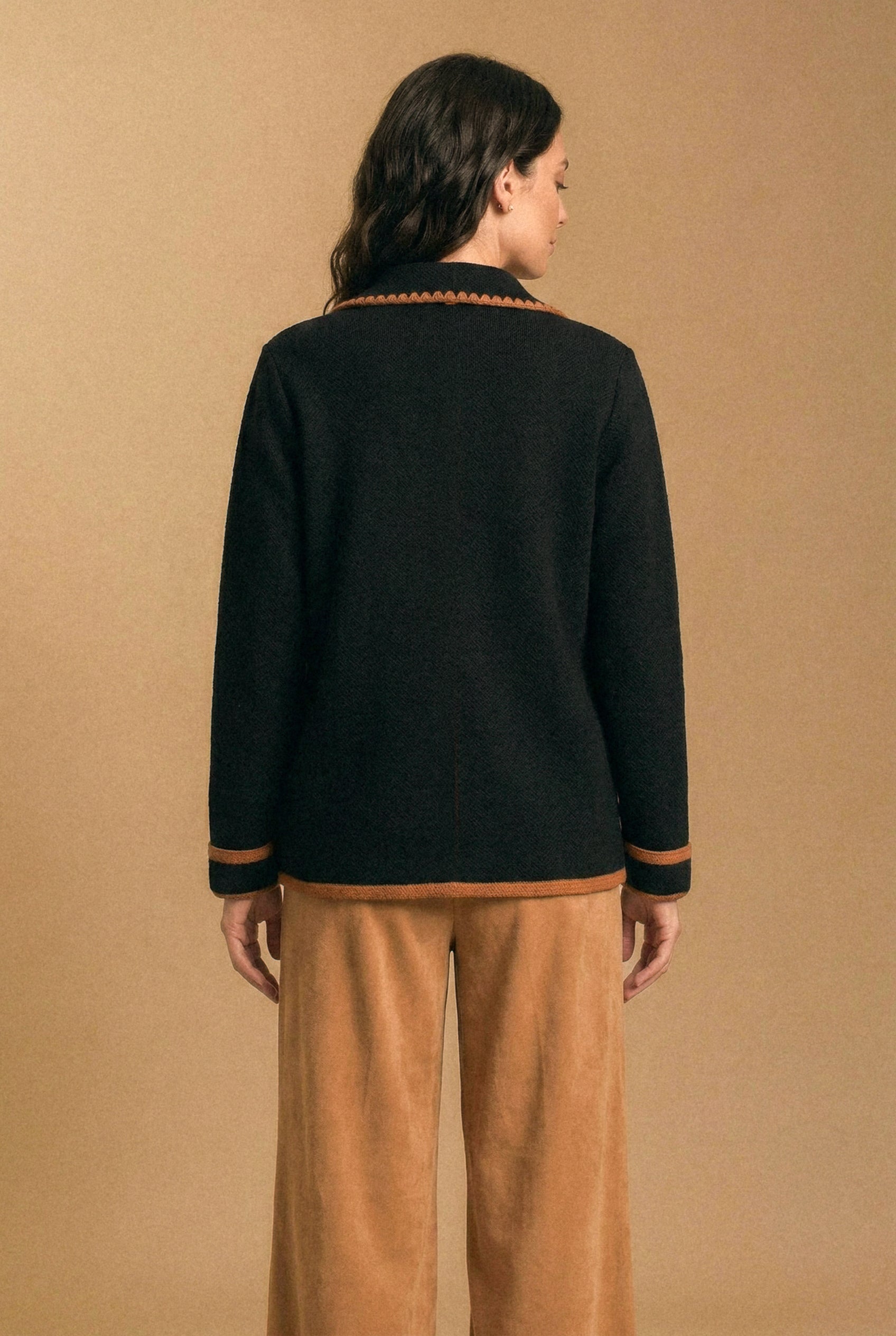 • Diseño: Chaqueta tipo blazer con un aire elegante y vintage. Tiene cuello sastrero, doble botón dorado en el frente y bolsillos amplios. El detalle en contraste a lo largo de los bordes, puños y bolsillos le da un toque único y sofisticado. Disponible en negro con ribetes camel, y crudo con ribetes negros.