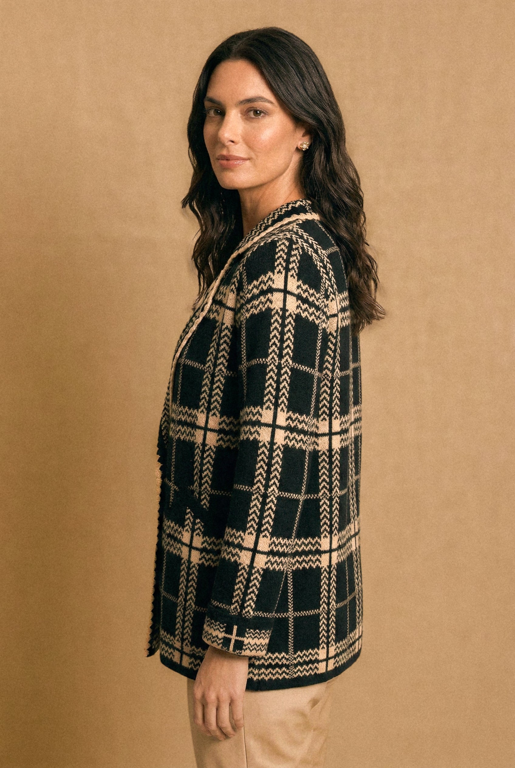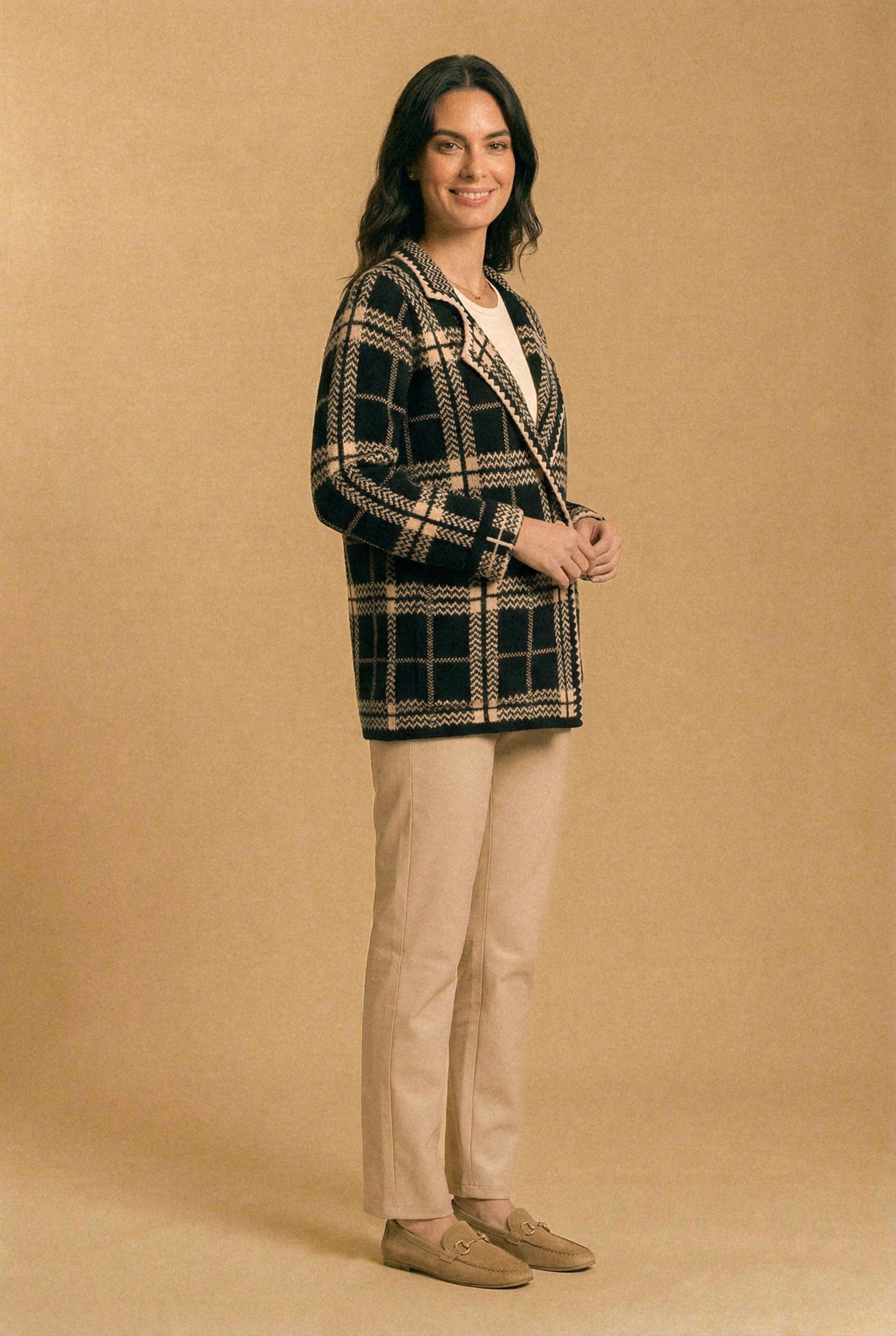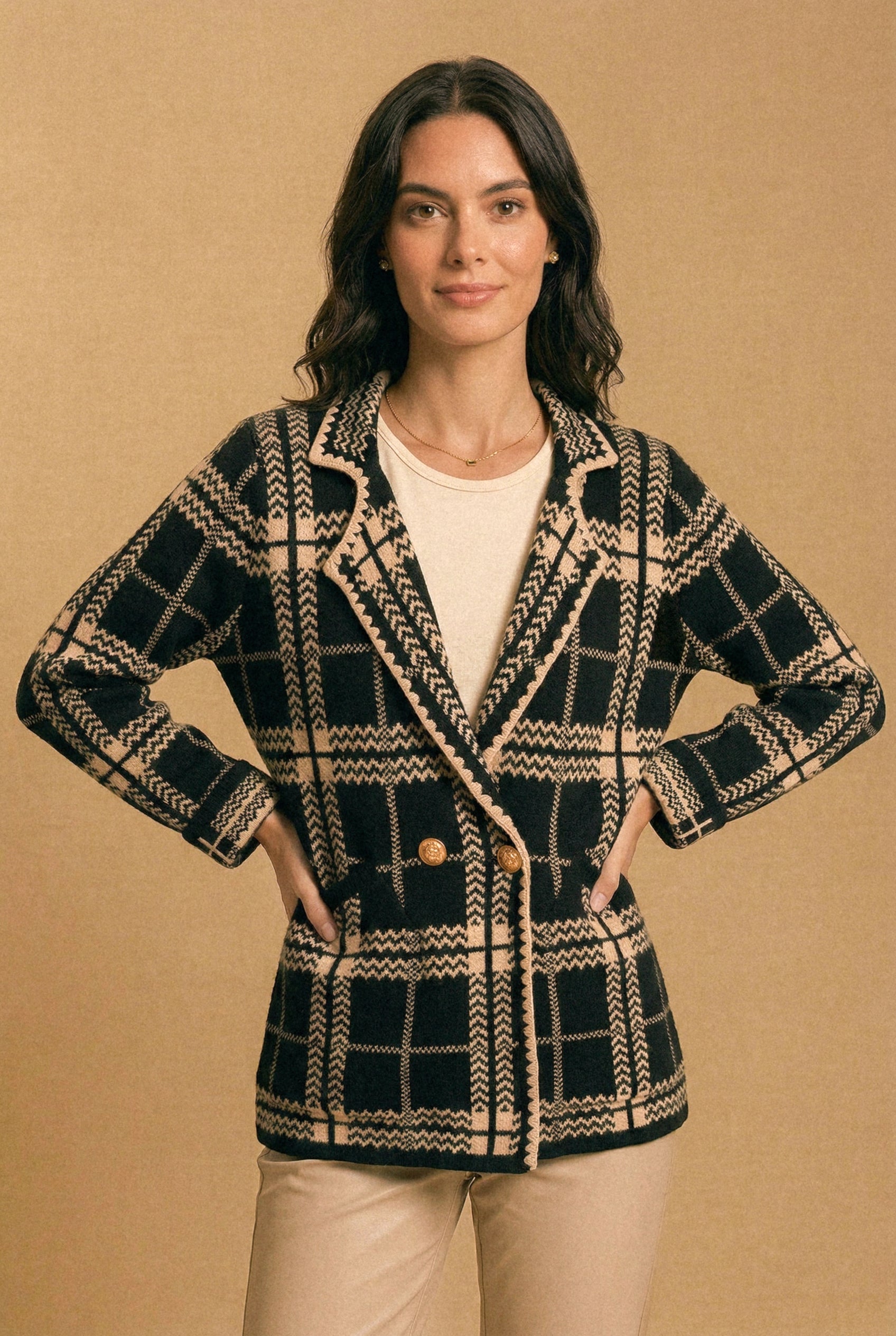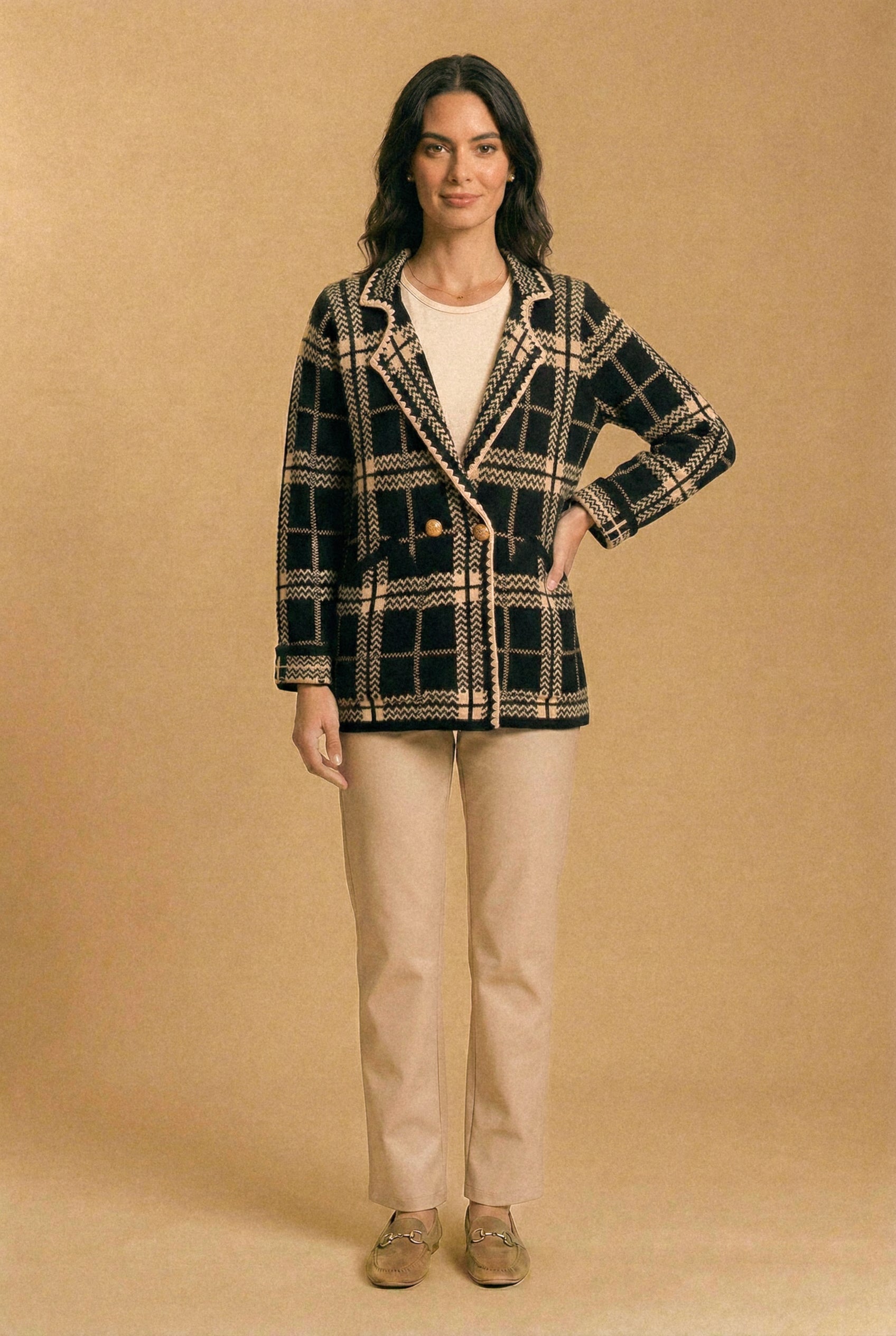 Diseño: Chaqueta tipo blazer tejida, con estructura definida, bolsillos delanteros y solapa clásica. Tiene un patrón a cuadros con detalle de zigzag que le da un aire retro muy especial. Los vivos en contraste —ya sea en negro, crudo o rojo según el modelo— le aportan carácter y estilo.