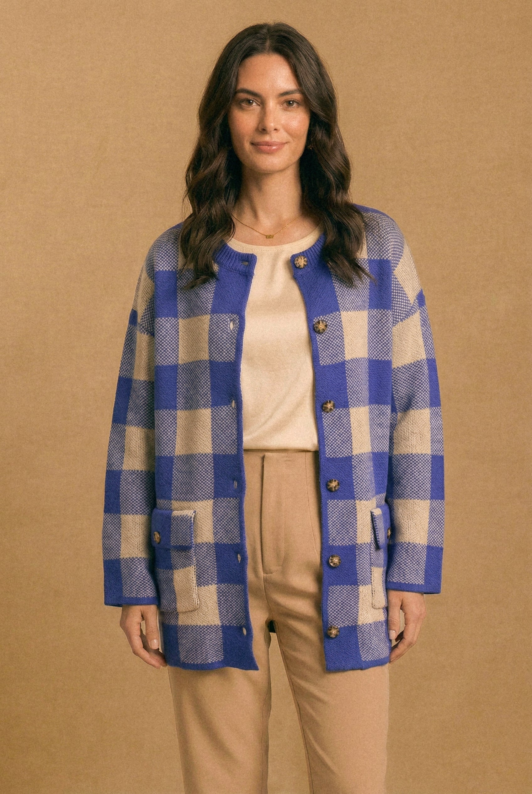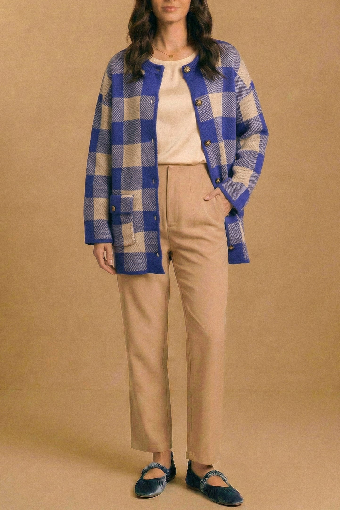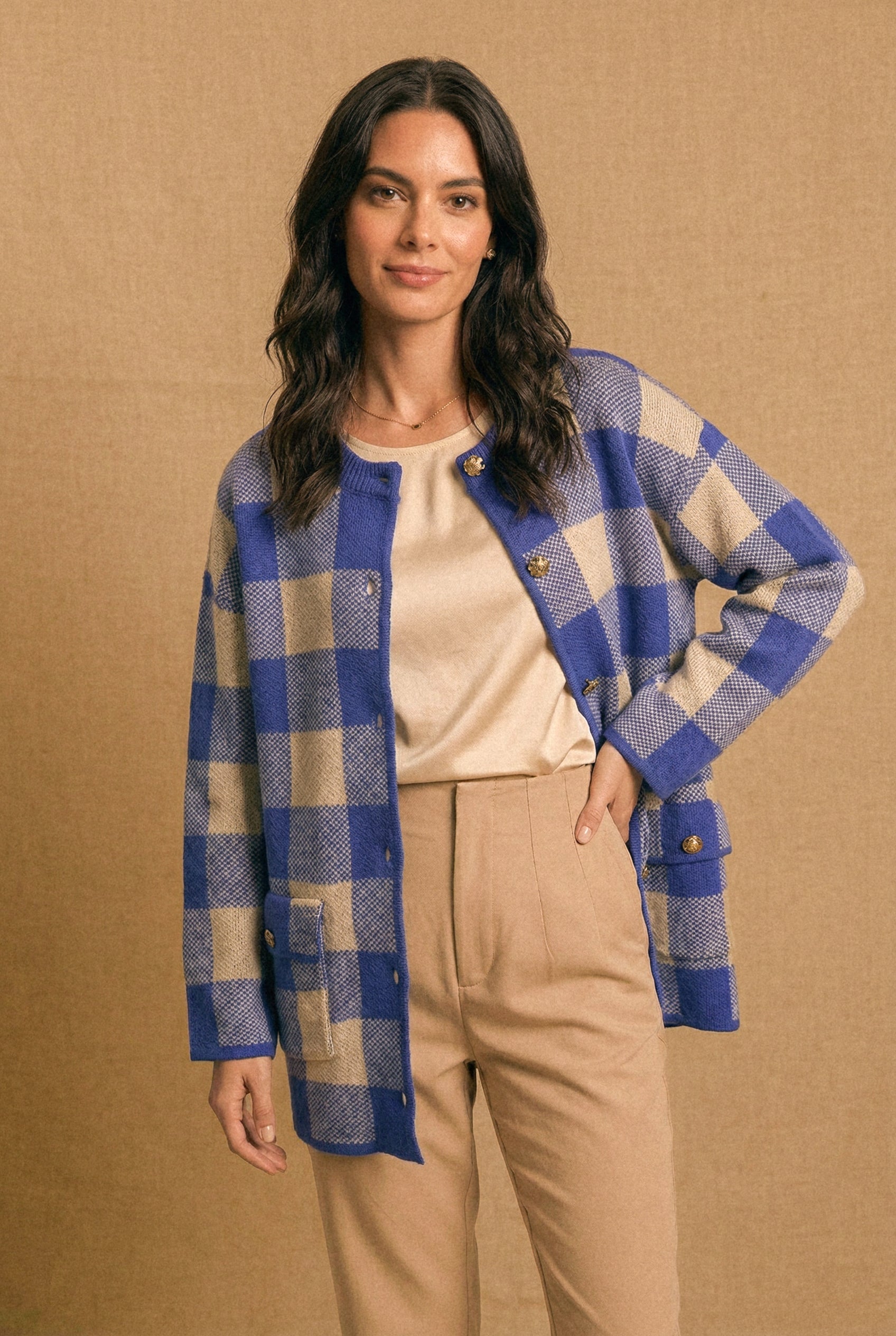 • Versatilidad: Puedes usarlo abierto o cerrado como chaqueta. Queda increíble con jeans, pantalones rectos o incluso sobre vestidos. El diseño en cuadros aporta un toque especial a cualquier look simple.