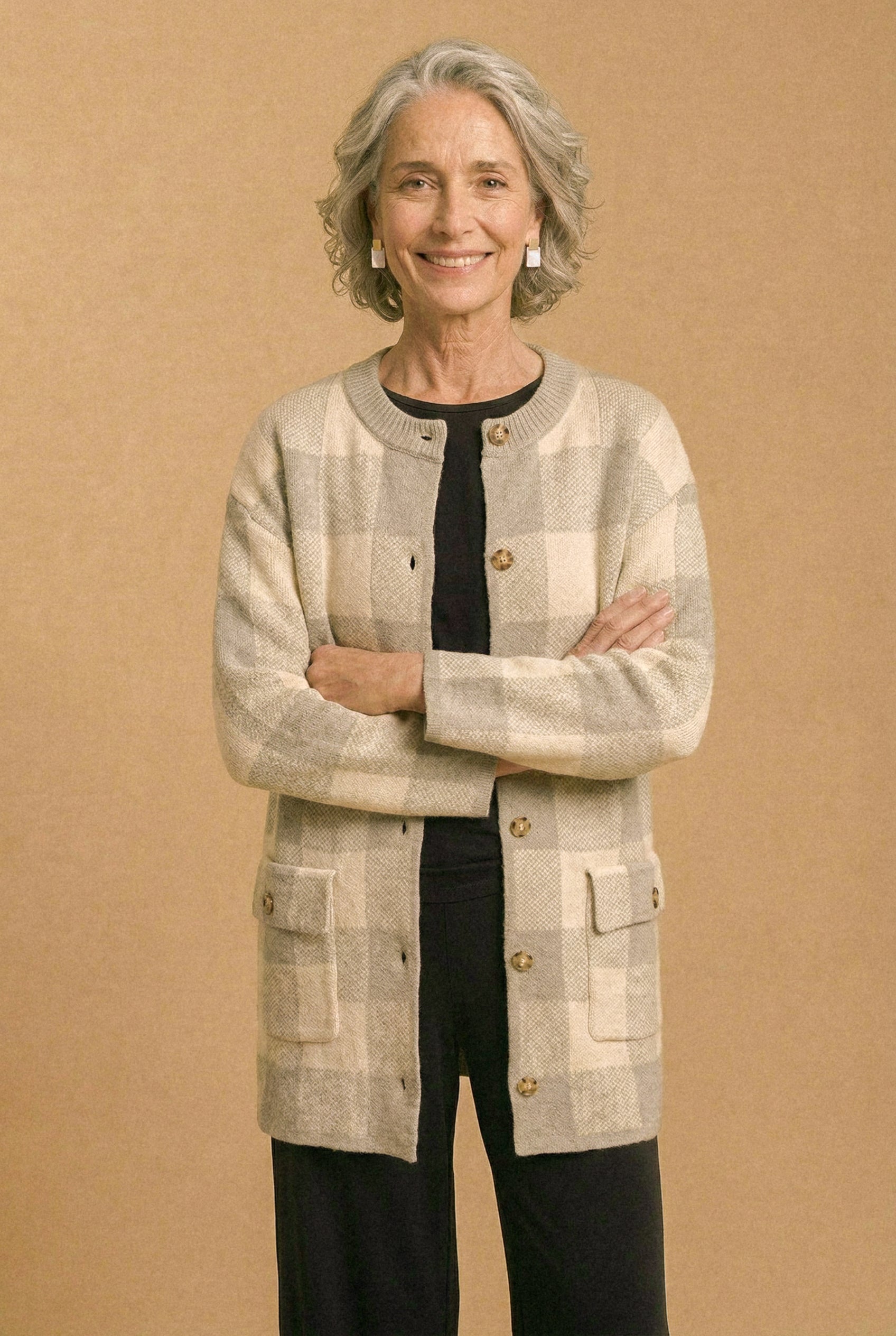 • Diseño: Chaqueta tejida de corte recto y largo medio, con botones y bolsillos grandes que aportan carácter. Su diseño a cuadros grandes en tonos combinados (gris o azul con crudo) le da un aire clásico, pero con mucha personalidad. Tiene cuello redondo y manga recta, lo que la hace fácil de superponer.