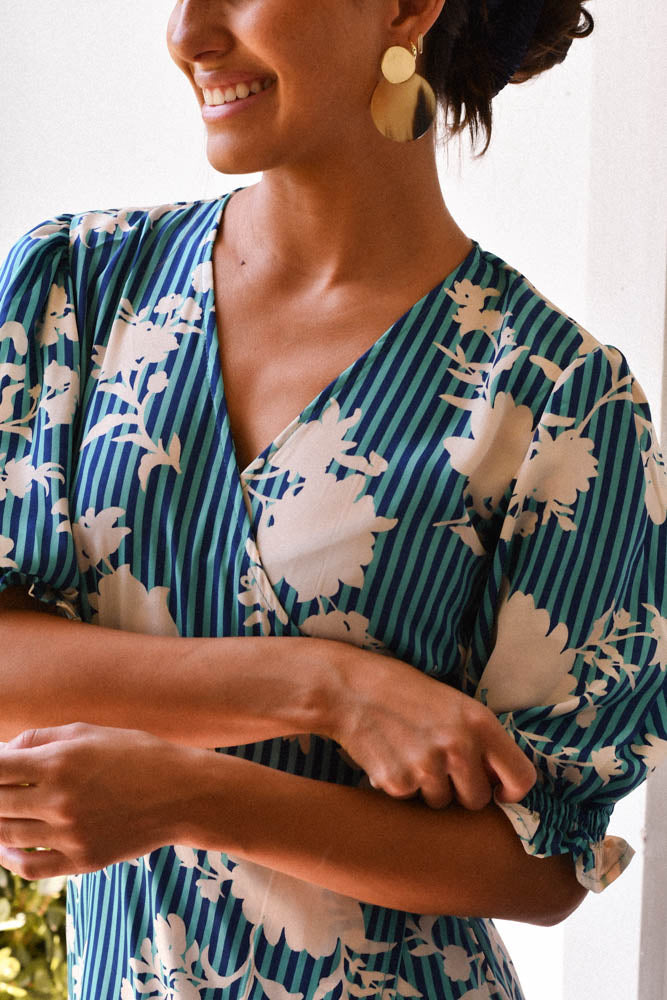 Diseño: Vestido largo con escote en V y mangas abullonadas tres cuartos con elástico en el puño. Tiene un lazo en la espalda que permite ajustar la cintura y un ruedo amplio con cortes que aportan movimiento.