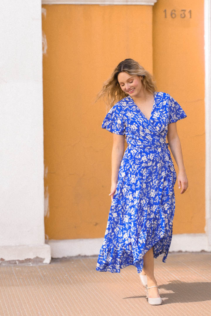 Diseño: Vestido largo envolvente con escote en V y manga corta con leve vuelo. Su amarra lateral permite ajustarlo a la cintura, realzando la silueta de manera femenina. El ruedo con volantes añade un toque romántico y liviano al movimiento.