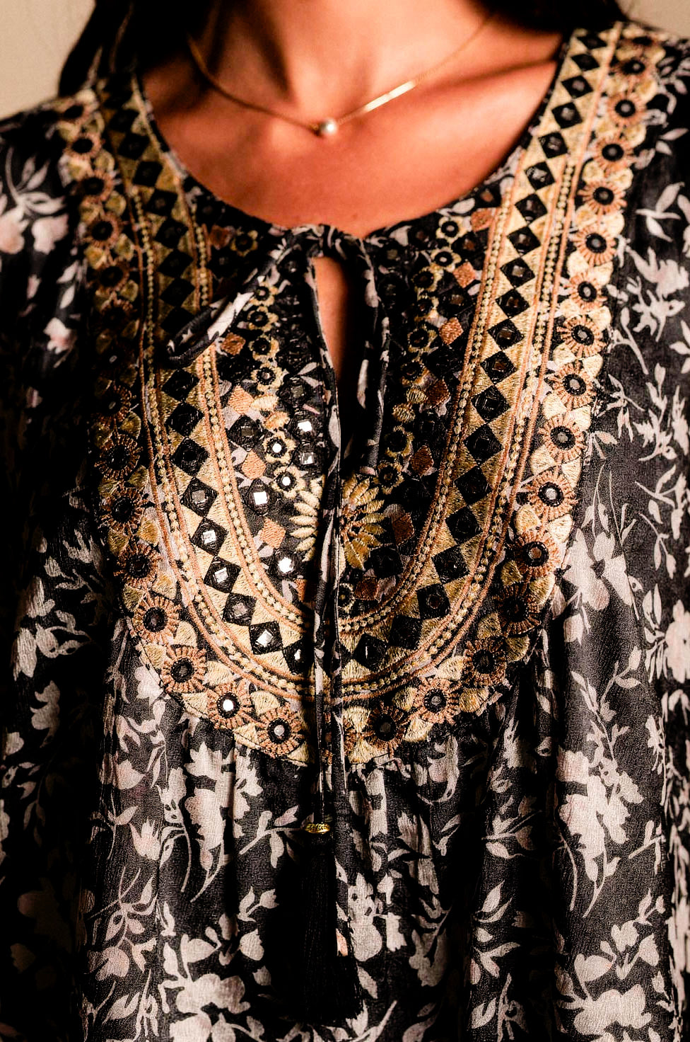 Diseño:Vestido corto de silueta relajada con escote redondeado y abertura frontal con lazo ajustable. Destaca por su aplicación decorativa en el pecho, que aporta carácter y un aire artesanal. Tiene mangas tres cuartos con volumen suave y un cuerpo amplio que genera movimiento y comodidad. Su calce es suelto, pensado para que se vea fluido y favorecedor.
