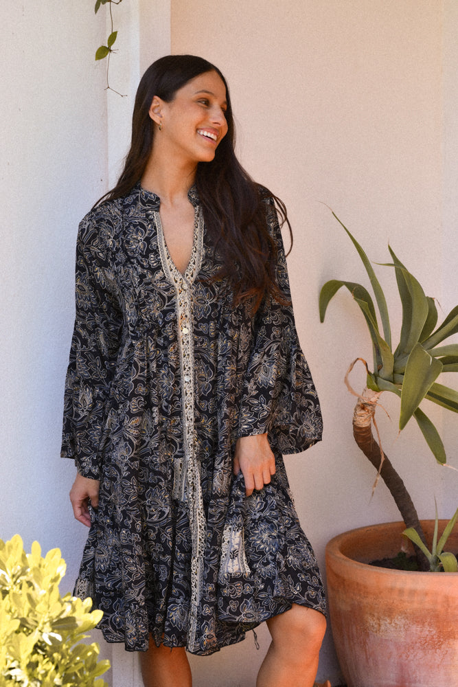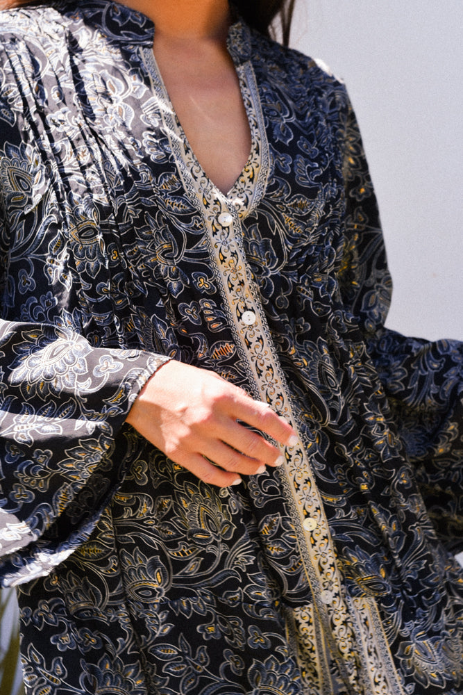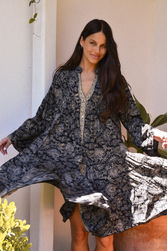 - Diseño: Vestido camisero de corte holgado con escote en V y botones funcionales en el frente. Sus mangas tres cuartos con volantes aportan un aire romántico y femenino.